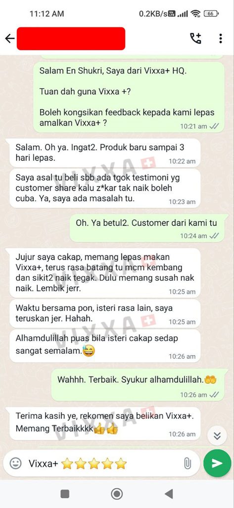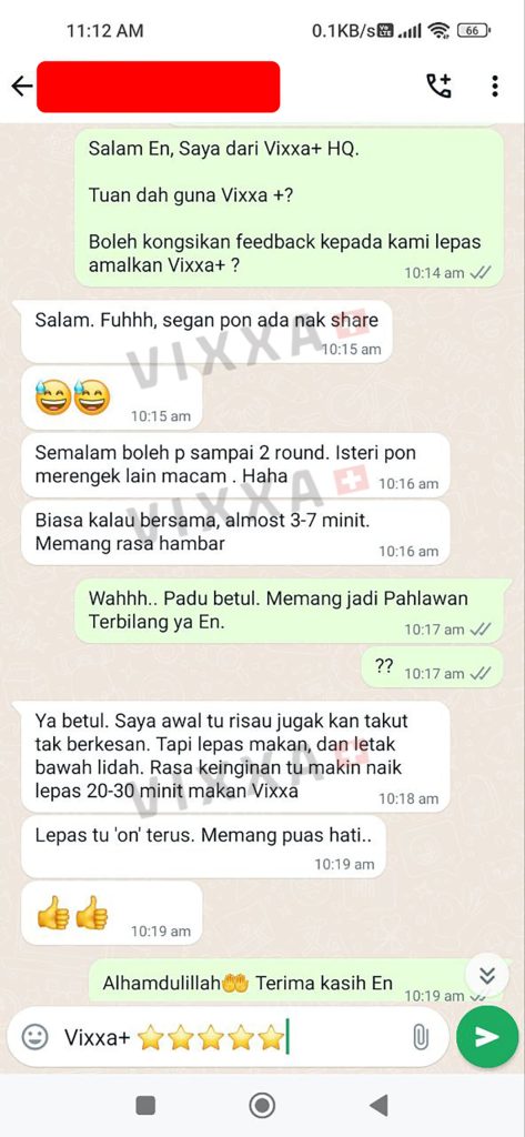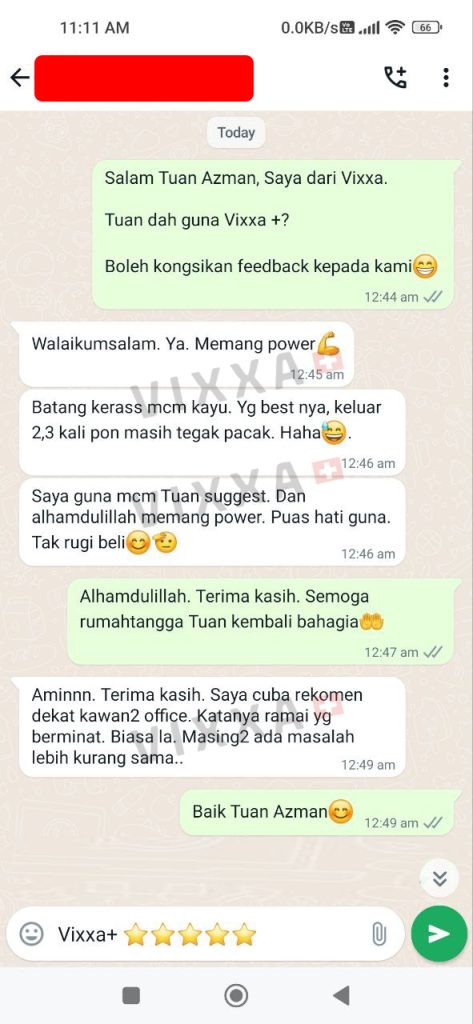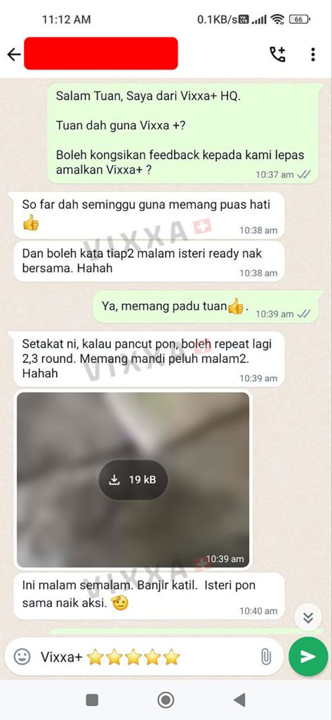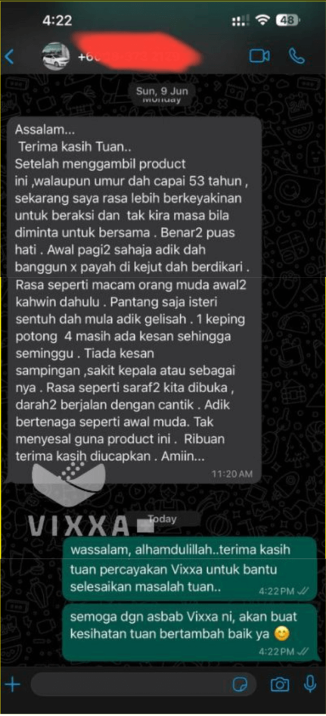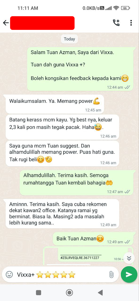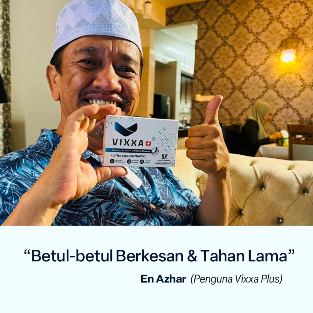 "Sebelum ni Encik Azhar ada masalah kencing manis 3tahun, hadapi masalah susah naik dan susah nak kembang lama, tapi lepas ikhtiar vixxa plus ni memang memuncak nafsu, awang mmg keras lama dan kembang habis!"
